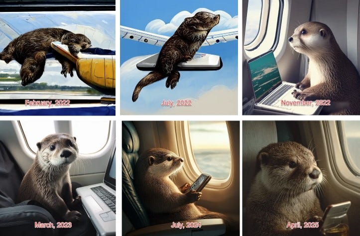Πρόσφατα ο Μόλικ ανήρτησε εδώ στο Substack ένα κολάζ εικόνων για όσα δημιούργησε για λογαριασμό του (και για την κόρη του) η ΤΝ, από τις αρχές του 2022 μέχρι την άνοιξη του 2025. Νομίζω πως το κολάζ του είναι όλη η ιστορία της εξέλιξης της GenAI ως προς τη δημιουργία εικόνων, μέσα σε μόλις τρία χρόνια και έξι εικόνες: από μια άμορφη μάζα γούνας χυμένη στην ουρά ενός απροσδιόριστου αεροσκάφους στις αρχές του 2022 και την ολοφάνερα τεχνητή εκδοχή της τον Νοέμβριο του ίδιου έτους, η βίδρα της GenAI έφτασε να είναι ένα πλήρως ρεαλιστικό ζώο τον Απρίλιο του 2025.