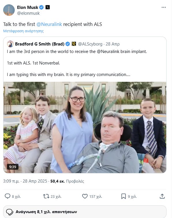 Τον περασμένο Απρίλιο, ο τρίτος ασθενής που δέχτηκε εμφύτευμα της διεπαφής εγκεφάλου-υπολογιστή της Neuralink (εταιρείας του Elon Musk), ένας άνθρωπος με ALS (την ασθένεια του Χόκινγκ), που δεν μπορούσε να πει λέξη, κατάφερε να ποστάρει ένα μήνυμα σε πραγματικό χρόνο στο «X», δακτυλογραφώντας με τον …εγκέφαλό του. Μάλιστα, η ΤΝ δεν περιορίστηκε σε αυτόν τον ρόλο. Έκανε …αυτοβούλως προσθήκες στο κείμενο που σκεφτόταν ο άνθρωπος και «πείραξε» το ύφος της γραφής. Με άλλα λόγια έγραψε το κείμενο με τρόπο που ο ίδιος πιθανώς δεν θα το έγραφε.